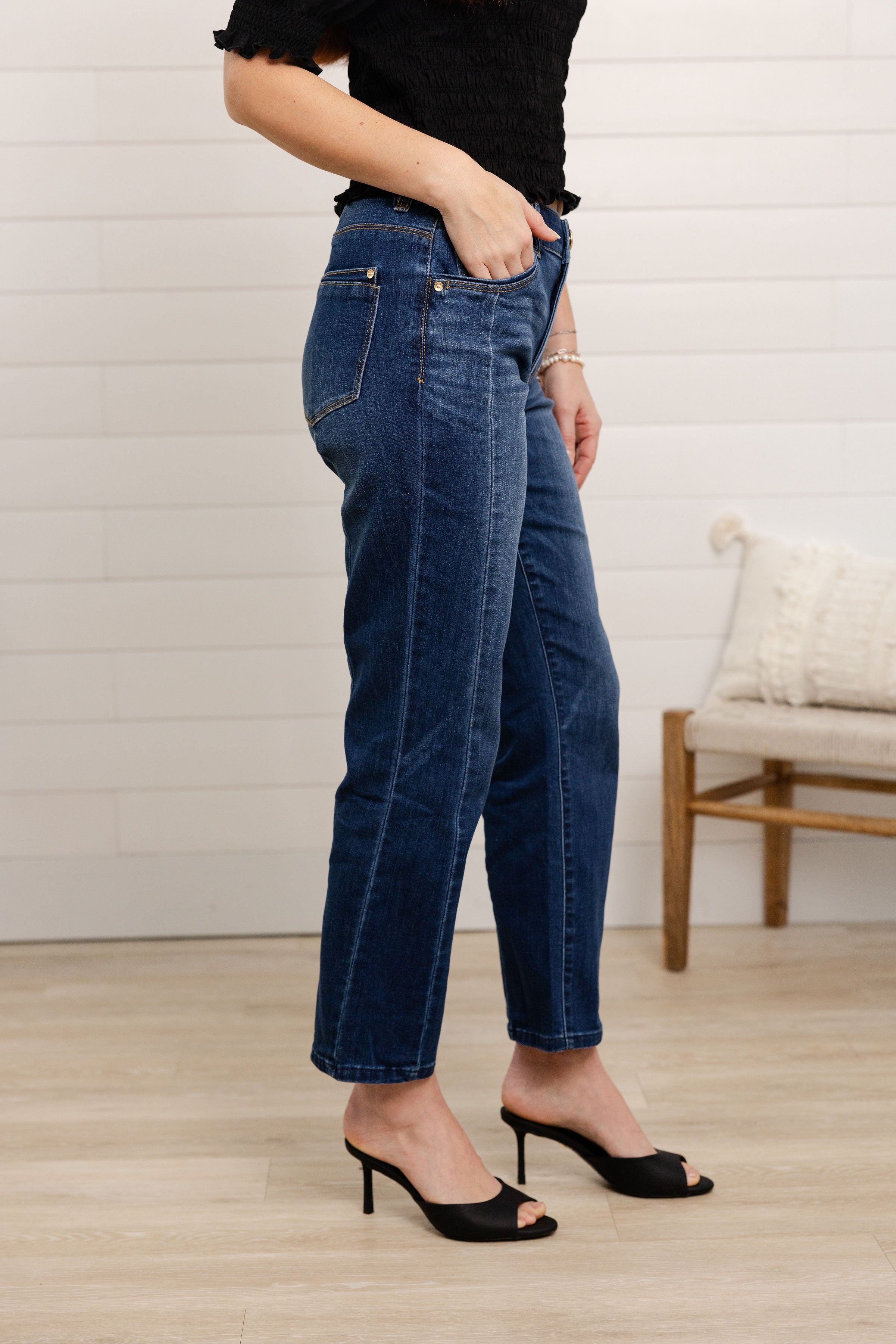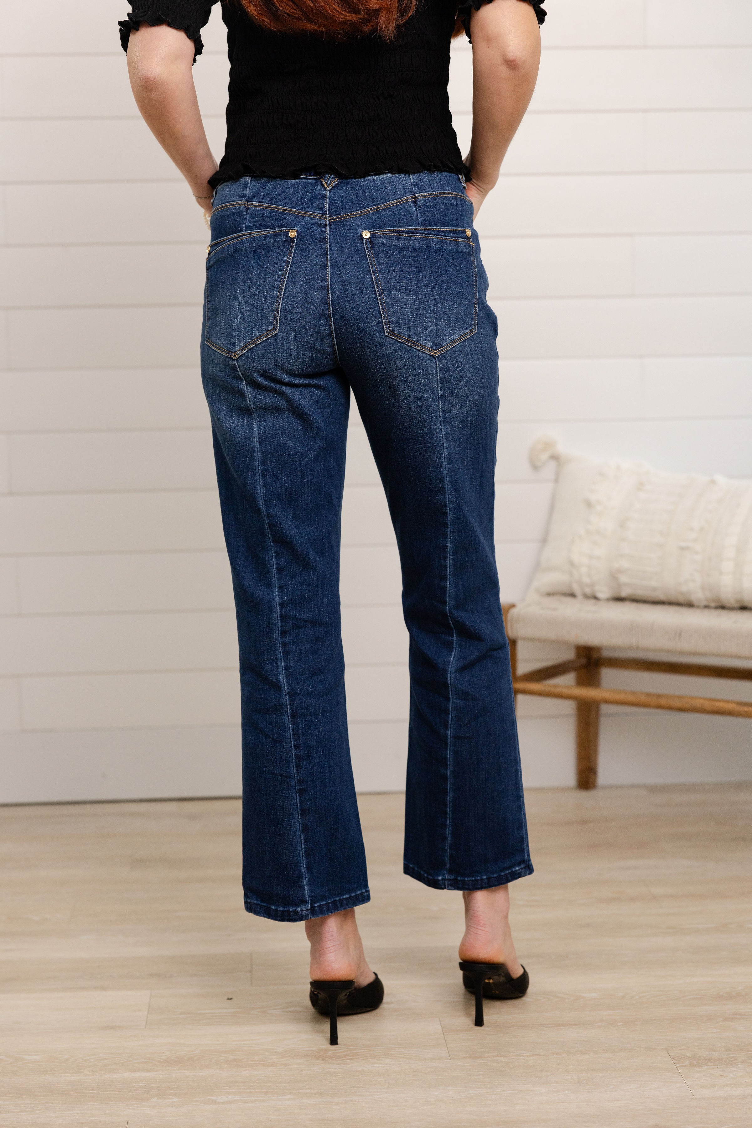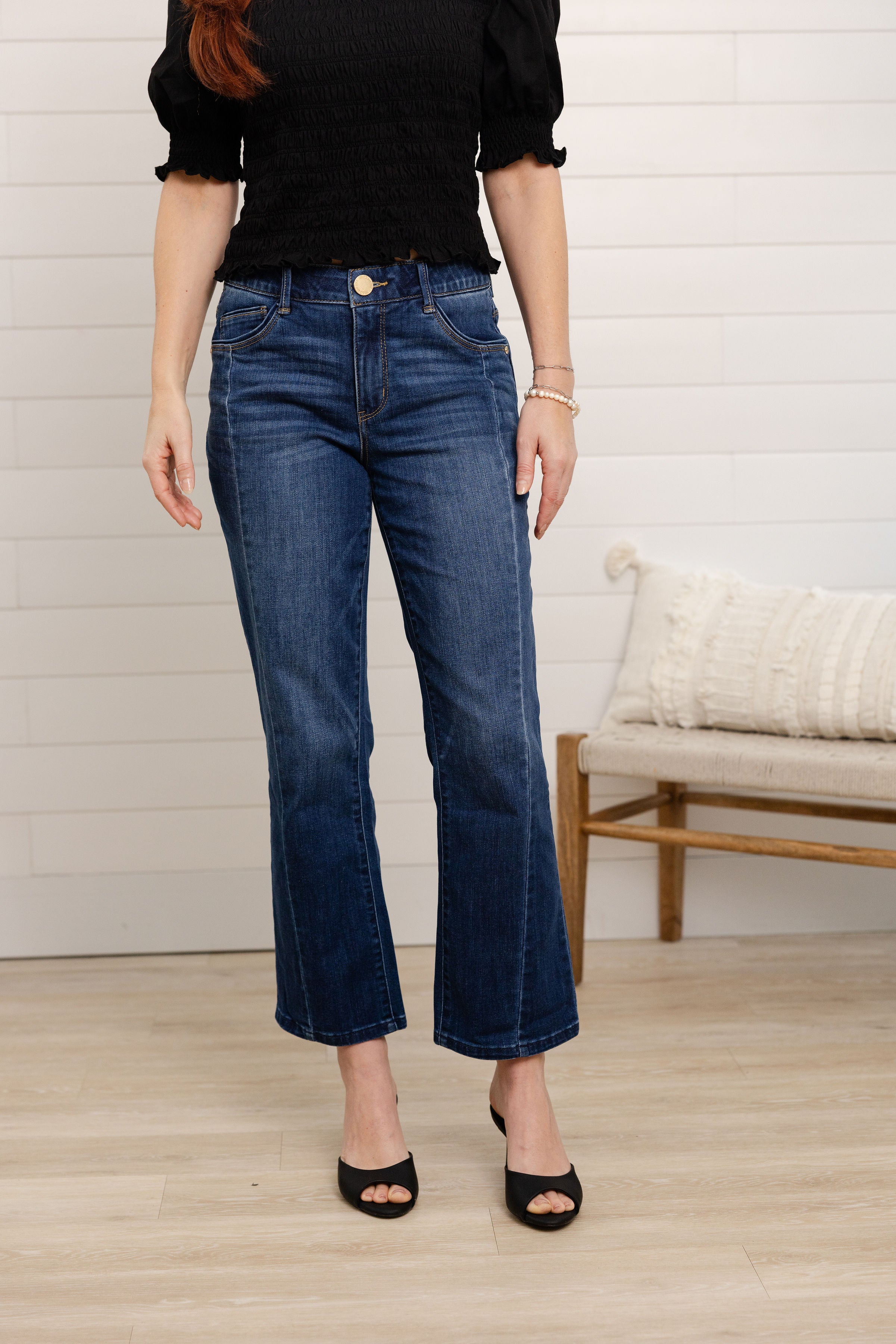 MAC AND ME KICK FLARE DENIM W/ FRAY HEM AND CENTER FRONT SEAM