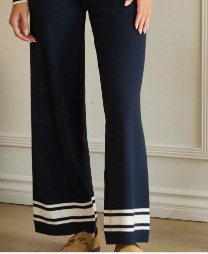 Elevate your everyday comfort with these navy knit pants, designed with a flattering wide-leg silhouette and finished with crisp white detailing along the hem. The soft, breathable knit fabric moves with you throughout your day, making them perfect for casual outings or relaxed work settings. Pair them with the matching sweater for a coordinated, effortless look that feels as good as it looks.