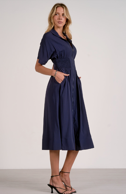 ELAN MIDI DRESS WITH ZIPPER FRONT AND SMOCK WAIST