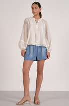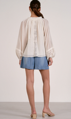 Embrace effortless bohemian style with this flowy top featuring a charming ruffle collar and delicate lace back detail. The relaxed silhouette pairs perfectly with the structured cord accents, creating a balanced look that transitions seamlessly from day to night. Ideal for layering or wearing solo, this piece brings texture and movement to any wardrobe. Perfect for those who love romantic, free-spirited fashion.