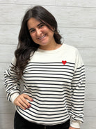 HEART EMBROIDEDRED CREW NECK LONG SLEEVE STRIPED SWEATSHIRT