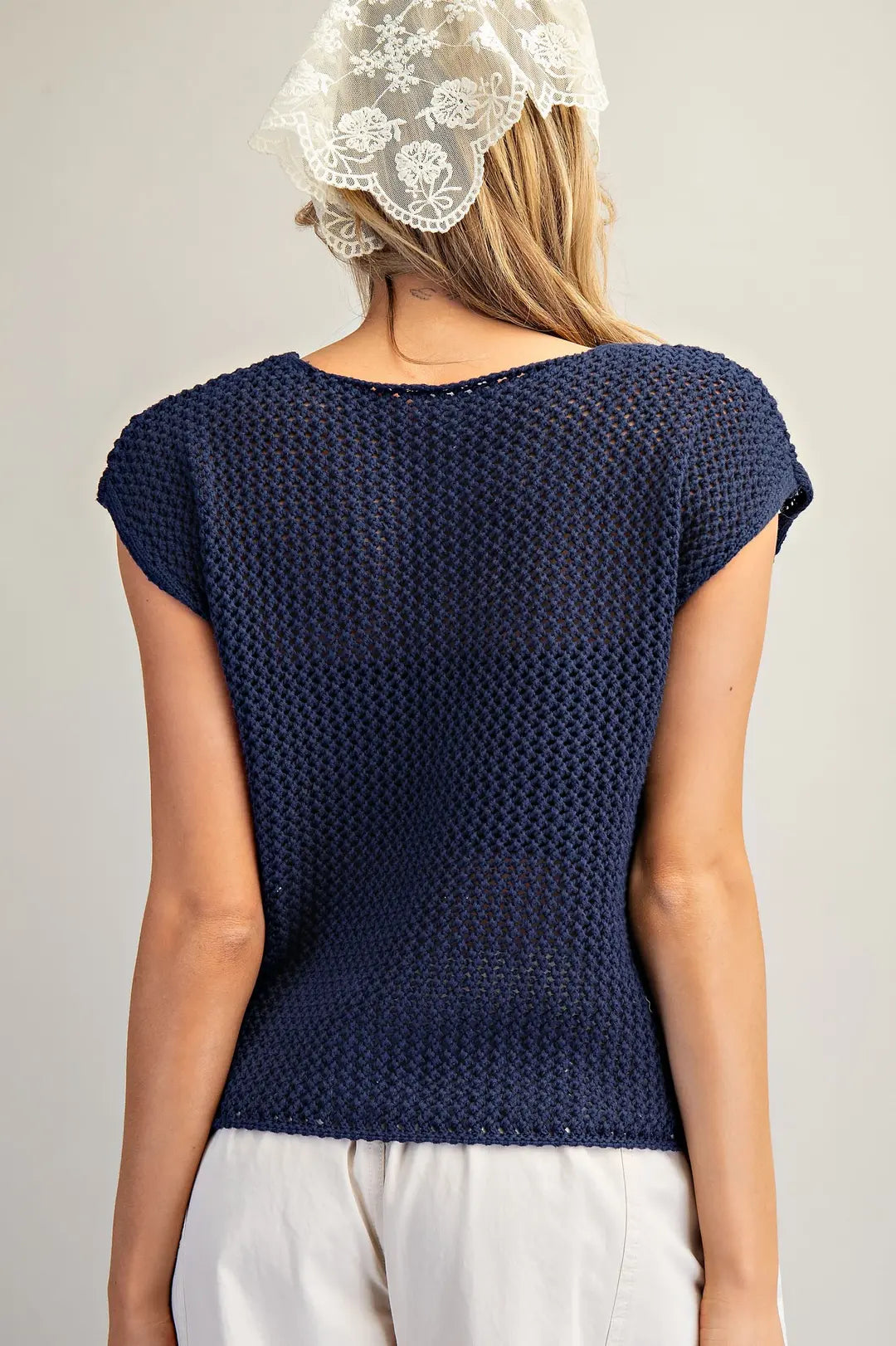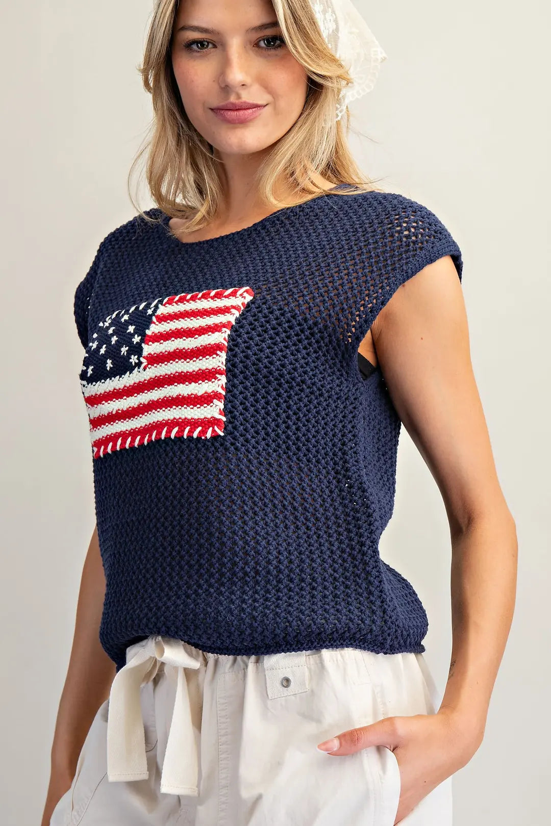 Elevate your patriotic wardrobe with this refined knit top, designed for effortless sophistication. The breathable open mesh construction ensures comfort throughout the day, while relaxed cap sleeves offer a flattering, contemporary fit. A striking American flag graphic—rendered as a textured, whipstitched patch—anchors the piece with understated elegance. Perfect for layering or wearing solo, this versatile top seamlessly transitions from casual outings to weekend gatherings.