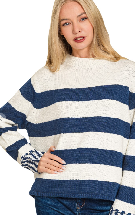 Embrace effortless style with this charming striped sweater, designed for a relaxed, boxy silhouette that flatters every frame. Soft stripes run throughout the body, while adorable striped cuffs add a playful finishing touch at the wrists and hem.
