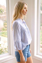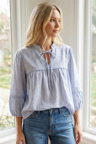 CHINA COLLAR TIE NECK TRIM DETAILED 3Q SLEEVE PINSTRIPED LINEN TOP