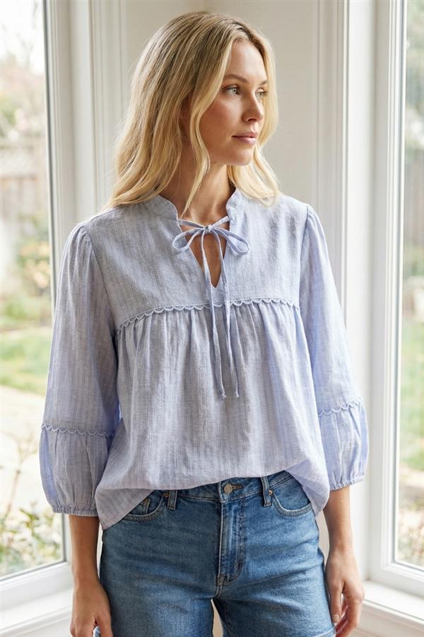 Elevate your wardrobe with this charming pinstriped linen top that effortlessly blends vintage-inspired details with modern comfort. The distinctive china collar and tie neck trim add a touch of sophistication, while the three-quarter sleeves offer the perfect balance between coverage and breathability. Crafted from breathable linen, this piece is ideal for warm-weather styling—dress it up with tailored trousers or keep it casual with your favorite denim. A playful nod to timeless fashion that works as hard as you do.