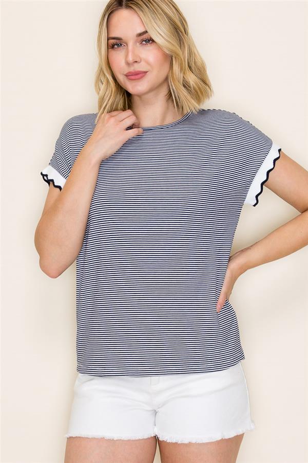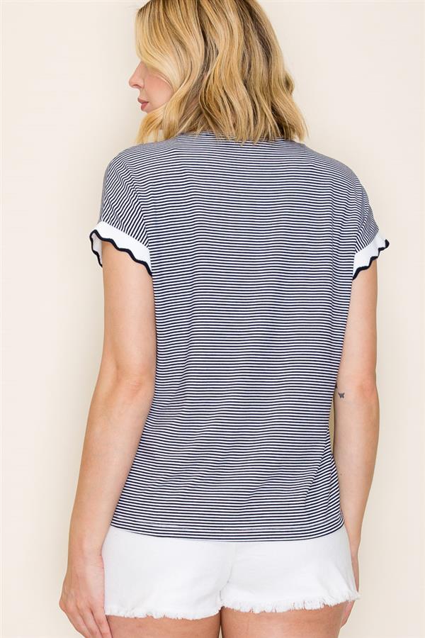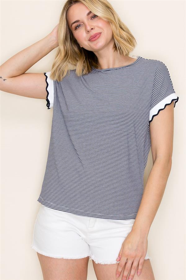 SCALLOP EDGE HEM SHORT SLEEVE PINSTRIPED TOP