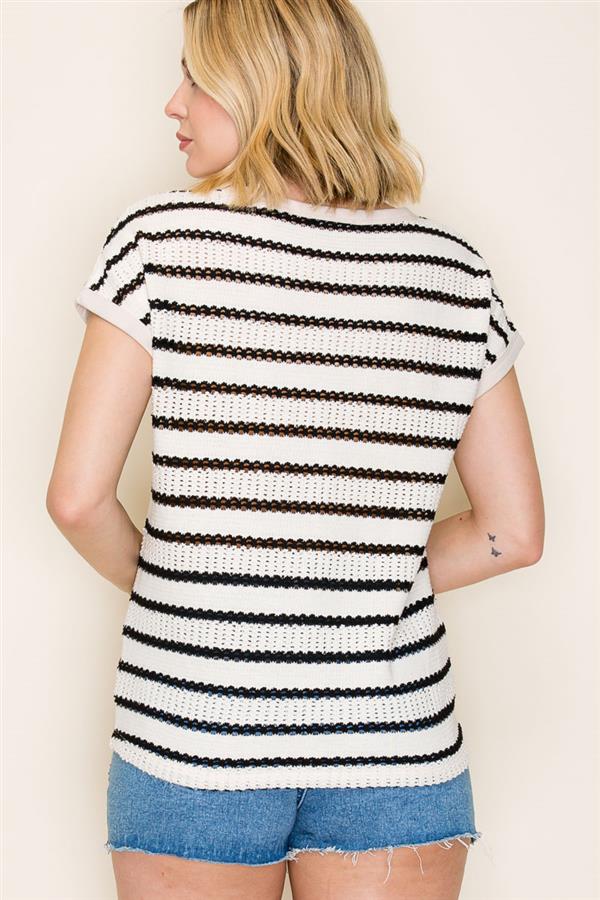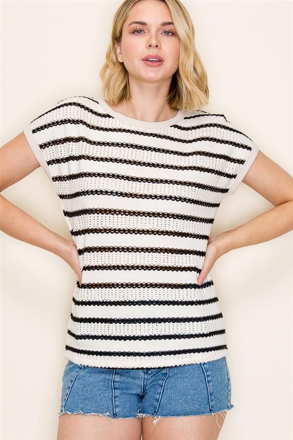 CREW NECK CROPPED SLEEVE POINTELLE STRIPED TOP
