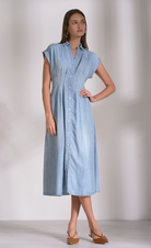 Embrace effortless charm with this adorable denim dress featuring midi cap sleeves that frame the shoulders beautifully. The timeless denim fabric offers durability and versatility, while the longer silhouette provides comfortable coverage for any occasion. Perfect for casual outings or dressed up with accessories, this sweet piece transitions seamlessly from day to night. A wardrobe essential that combines classic style with modern comfort.