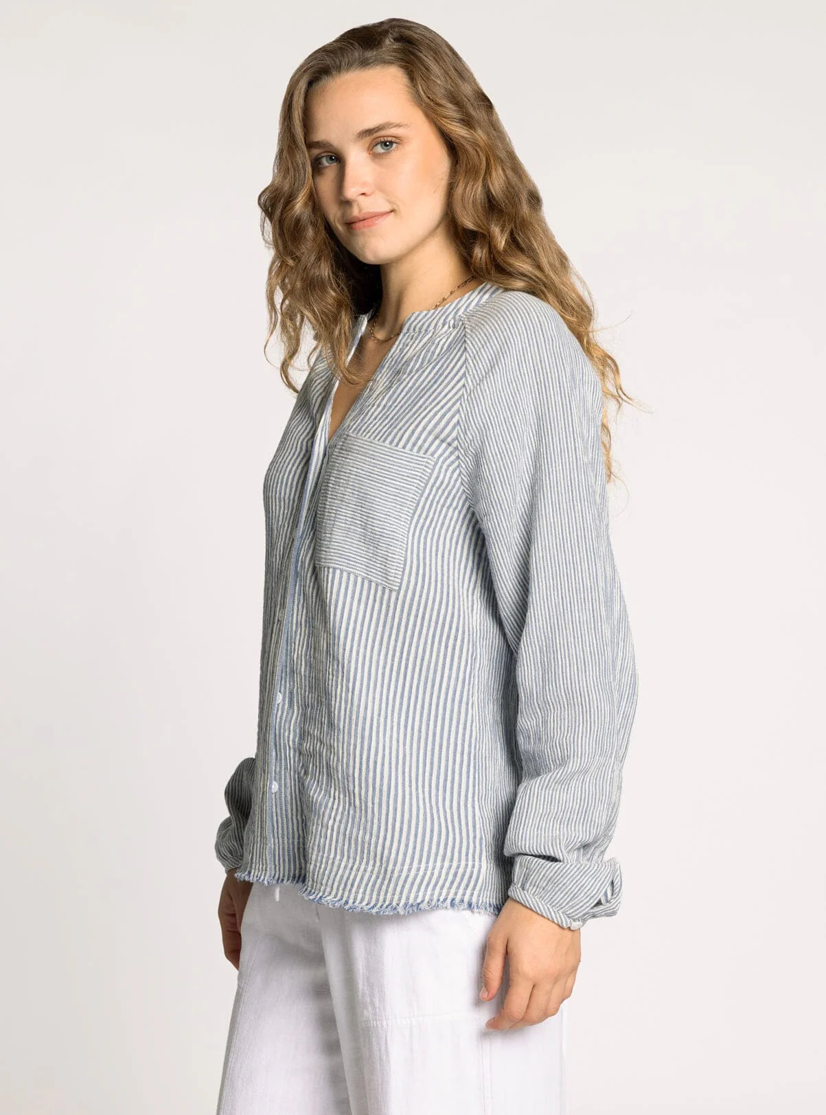 The Maia Shirt combines effortless elegance with thoughtful design details. This sophisticated piece features a flattering V neckline and button-front closure for versatile styling, while raglan sleeves provide comfortable movement. Dual chest pockets add practical functionality without compromising the refined aesthetic. The raw hem detail introduces a subtle edge that elevates the classic silhouette. Crafted from 100% cotton, it's breathable and durable for everyday wear.